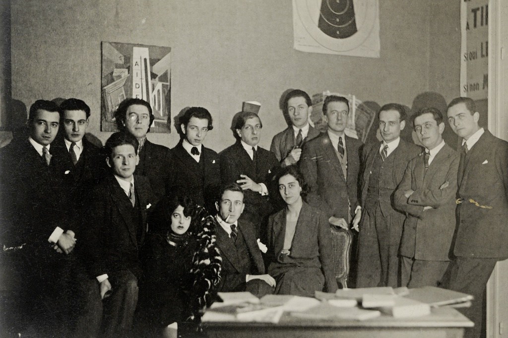 (De izquierda a derecha, de pie: Jacques Baron, Raymond Queneau, Pierre Naville, André Breton, Jacques-André Boiffard, Giorgio de Chirico, Roger Vitrac, Paul Eluard, Philippe Soupault, Robert Desnos y Louis Aragon; sentados: Simone Breton, Max Morise, Marie-Louise Soupault)